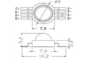 Мощный светодиод типа Emitter, d=9 мм, h=5.2 мм. Чипы EPILEDS 30 mil. Цвет свечения RGBW: красный (620-630 нм), зеленый (520-530 нм), синий (460-470 нм), белый. Угол излучения 120-140°. Световой поток 50-60 лм (красный), 80-90 лм (зеленый), 20-30 лм (синий), 130-140 лм (белый) при If = 350 мА, P=4 Вт. VF=2.0-2.4 В (красный), VF= 3.0-3.4 В (зеленый/синий/белый). Управляется RGBW контроллером тока, или любым RGBW-контроллером через конвертор сигнала напряжения в ток.
