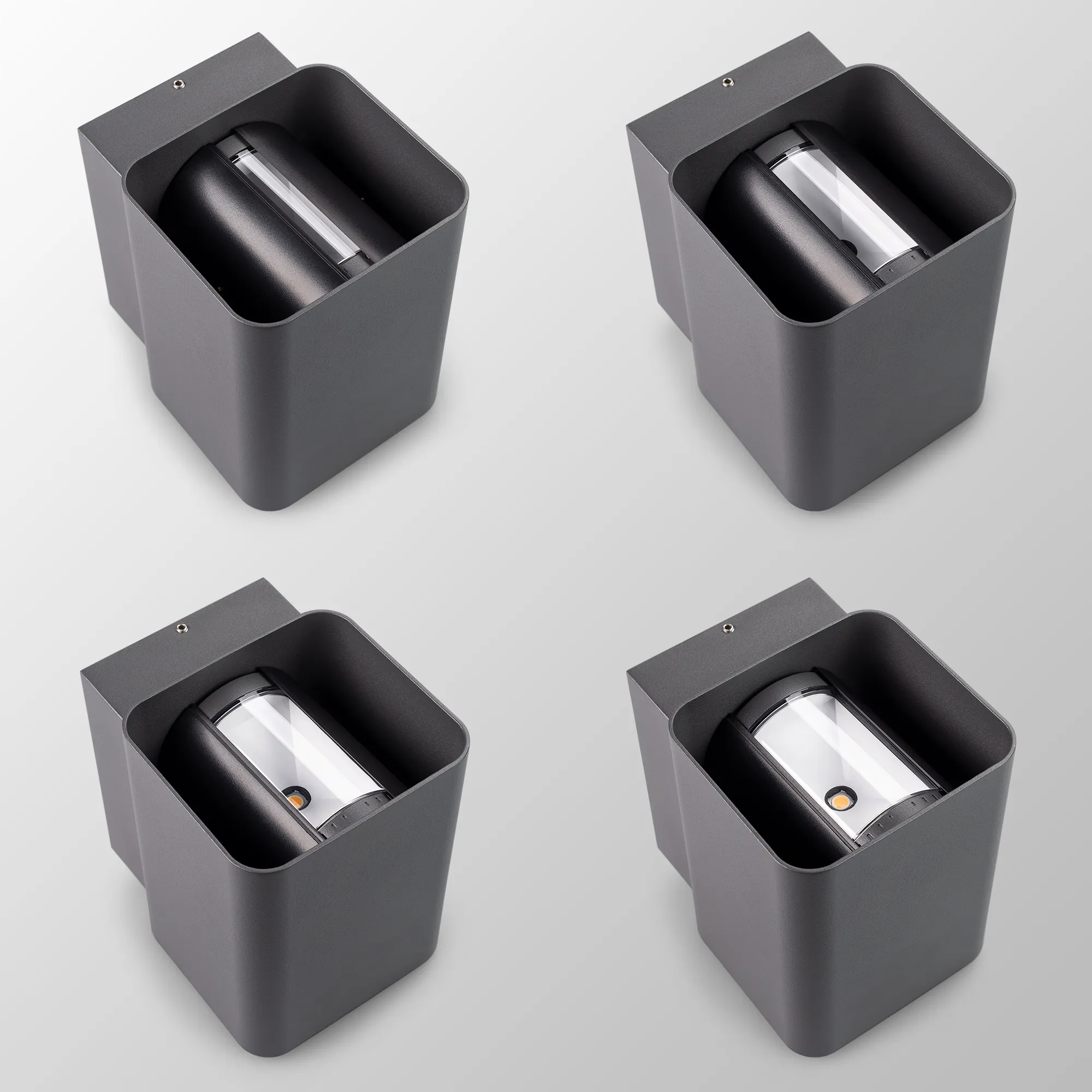 Уличный светодиодный светильник для стен, изменяемый угол освещения 0°-80°, свет вверх-вниз на 2 стороны. Цвет ТЕПЛЫЙ БЕЛЫЙ 3000К, светодиоды 2x6Вт CREE (750 лм). Влагозащищенный корпус IP54 - черный (RAL9011) алюминий, экран ударопрочный PC. Питание 230В, мощность 12 Вт. Размеры ВхШхГ -138х104х129 мм.