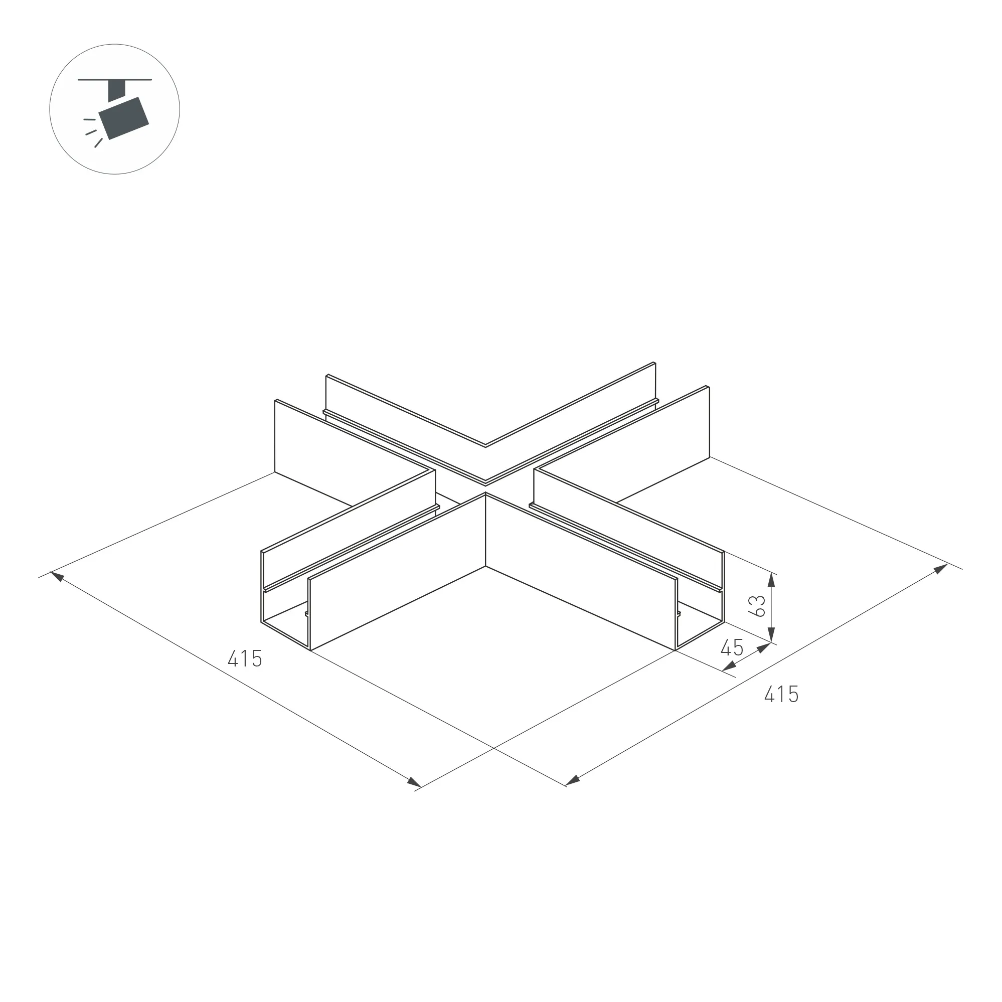 Крестовой прямой коннектор для трека MAG-TRACK-4563. Материал алюминий, цвет черный. Размеры 415x415x45x63мм. DC24V.