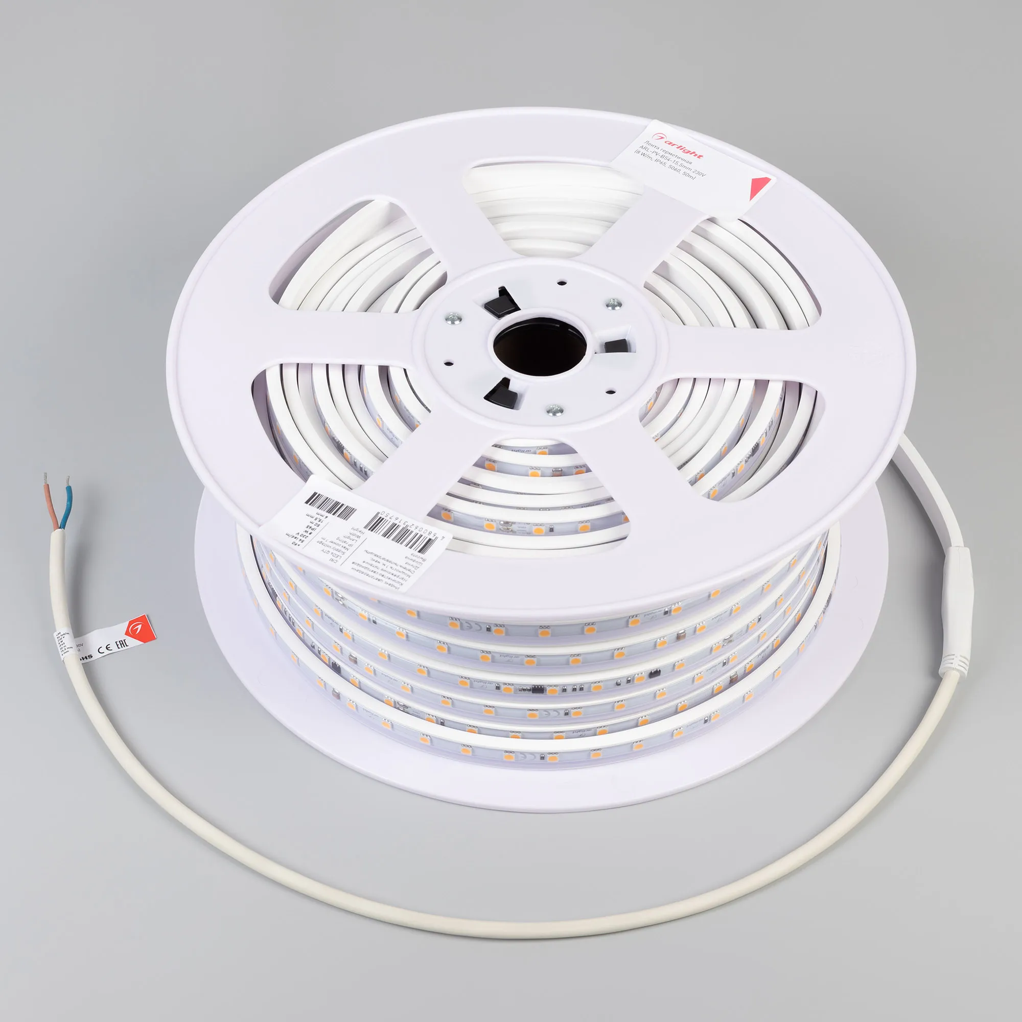 Светодиодная герметичная лента ARL серии B54, IP65 (PV - трубка, ПВХ экструзия). Светодиоды 5060, 54 шт/м, белая плата шириной 12 мм. Цвет ТЕПЛЫЙ 3000K, индекс цветопередачи CRI>90, угол 120°. Питание 230 В, мощность 8 Вт/м (80 Вт на 10 м). Размеры 10000x15.5x6 мм. Мин. отрезок 500 мм, 27 светодиодов. Цена за 1 м. Светодиодная лента крепится с помощью скоб (приобретаются отдельно), 3M скотч отсутствует. Катушка 10 м.