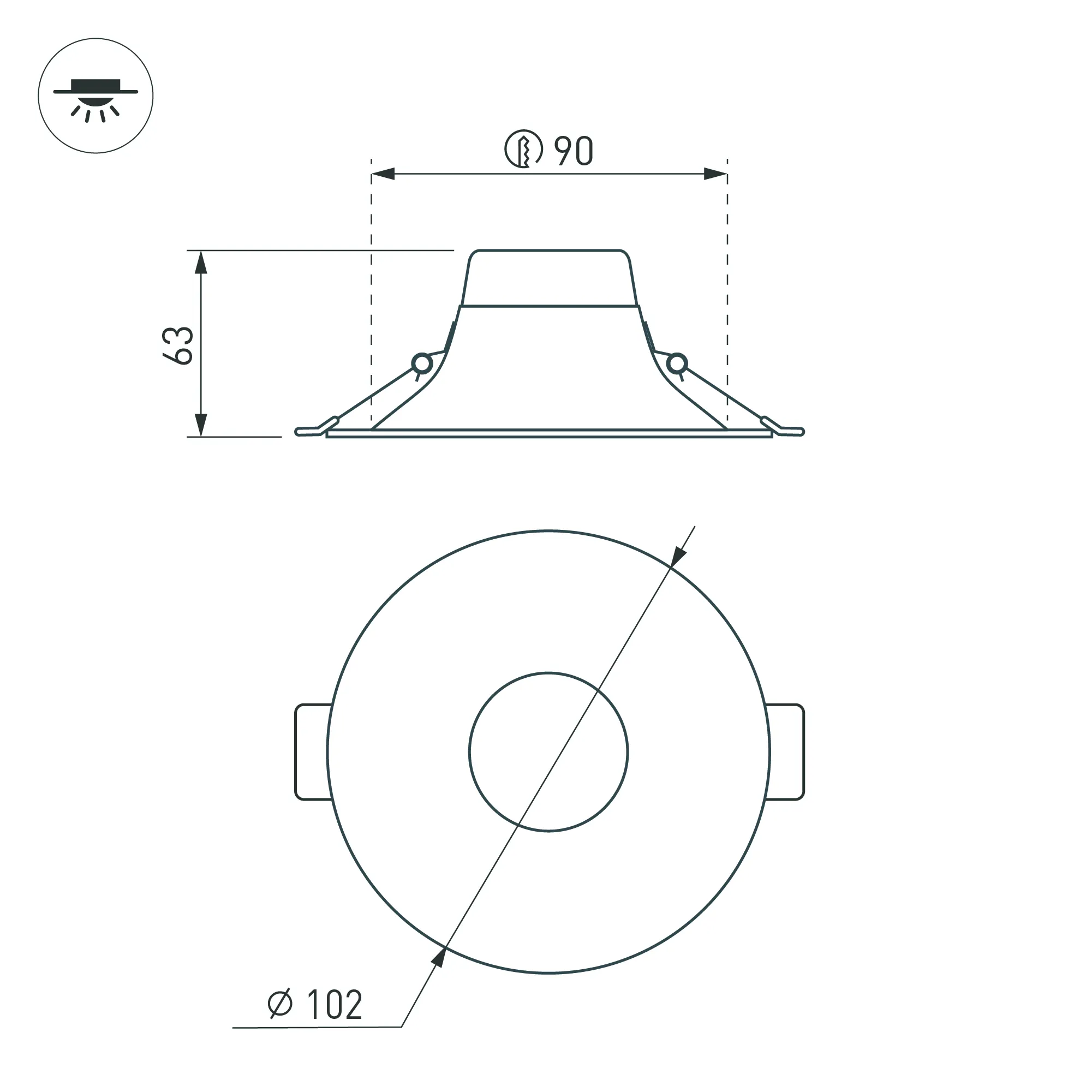Встраиваемый светильник даунлайт с интегрированным в корпус драйвером. Мощность 7.6 Вт, св. поток 540 лм, 71 лм/Вт, дневной 4000 K, CRI>90, угол 100°, напряжение питания 230 В. Черный круглый корпус из алюминия, степень защиты IP20. Размер: диаметр 102 мм, высота 63 мм. Монтаж встраиваемый, установочное отверстие: диаметр 90 мм. Пульсация <2%.