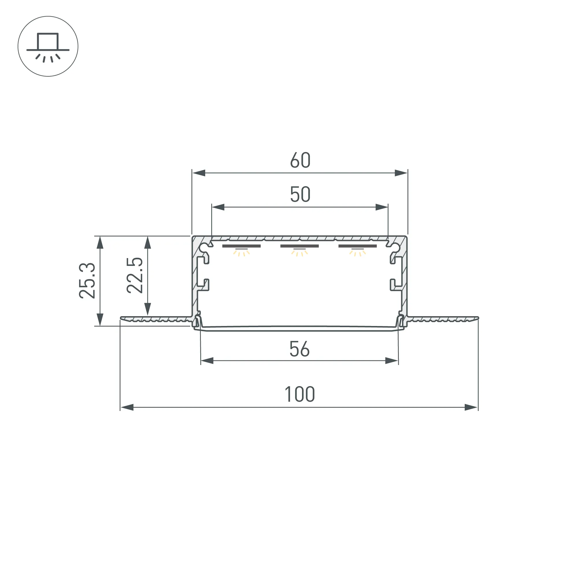 Алюминиевый анодированный профиль для встраивания в гипсокартон. Габаритные размеры (L×W×H): 3000x100x25,3 мм, паз для установки 60х22,5 мм. Ширина площадки для ленты - 50 мм. Экраны и заглушки приобретаются отдельно. Цена за 1 метр.