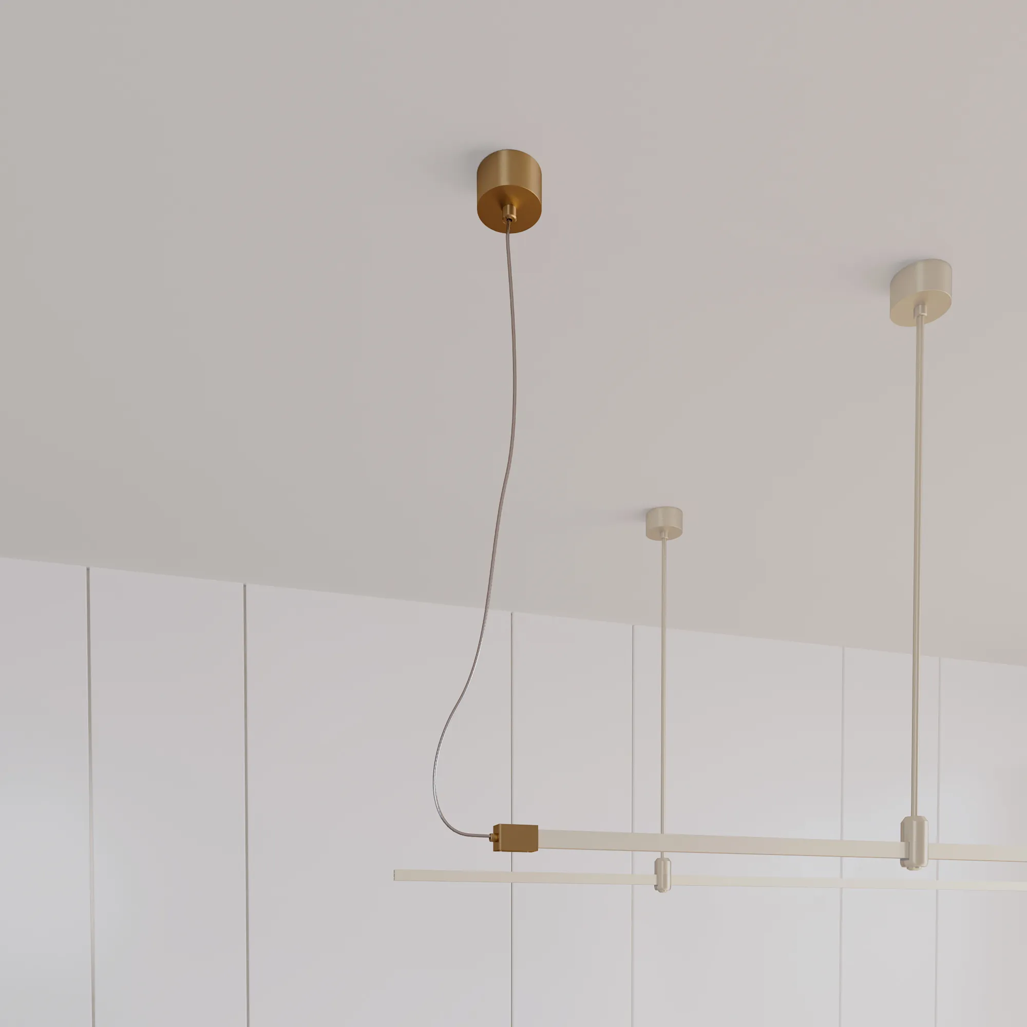 Потолочная чаша с боковым подводом питания треков системы APRIORI. Напряжение питания DC48V. Диаметр чаши 80 мм, внутренний диаметр чаши 74мм, внешняя высота чаши 38 мм, глубина чаши до монтажного отверстия 25 мм, общая высота подвеса 5000 мм. Материал алюминий, цвет светлое золото.