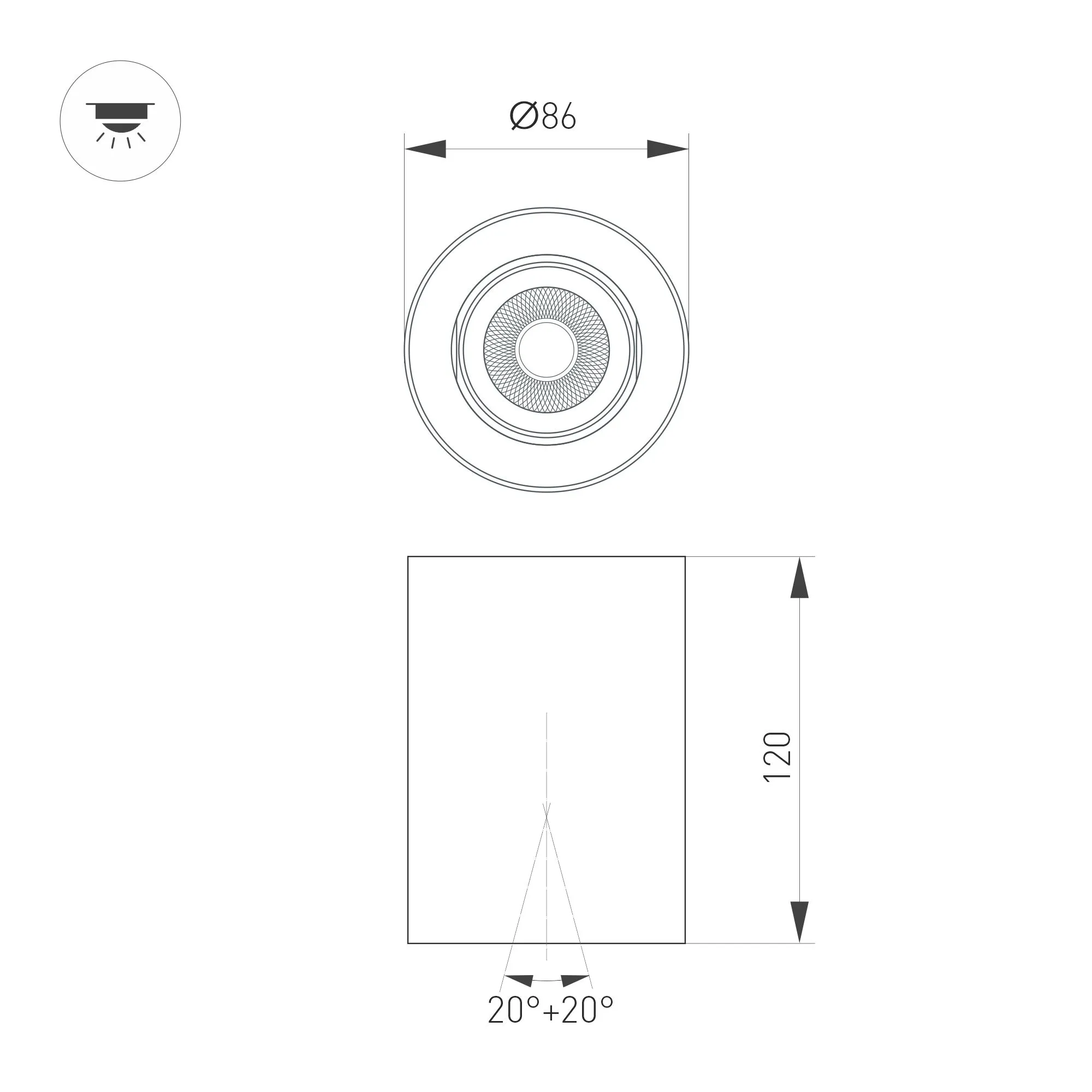 Накладной интерьерный светильник. Мощность 10 Вт, св. поток 970 лм, 93 лм/Вт, дневной 4000 K, CRI>90, угол 24°, регулируемое направление луча 40° (20+20), поворотный световой модуль вокруг своей оси на 340°, UGR <18, напряжение питания 230 В. Черный круглый корпус из алюминия, степень защиты IP54. Размер: диаметр 86,5 мм, высота 120 мм. Монтаж накладной. Драйвер 27-43 В, 250 мА, пульсация <1%.